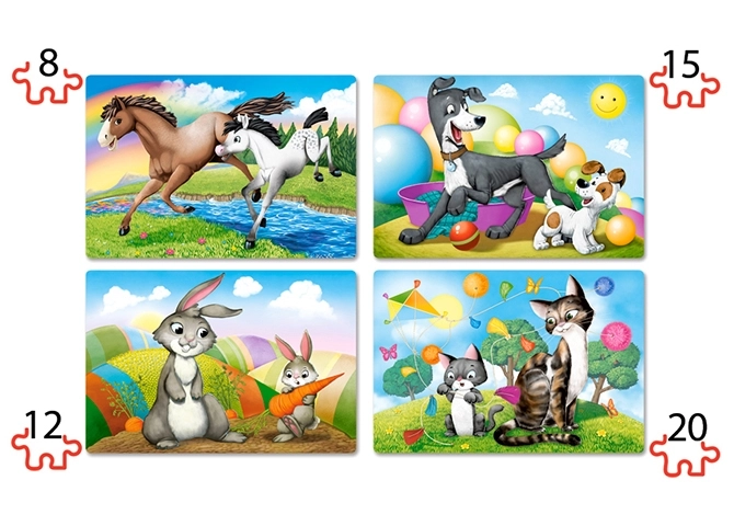 Sada 4v1 - s obrázkami zvieratiek obsahuje 4 puzzle pre malé deti.Každý obrázok má iný počet dielikov - 8, 12, 15 a 20 dielikov. Rozmer jedného obrázku je cca 29 x 20 cm.Veľkosť krabice je 33 x 23 x 5 cm.